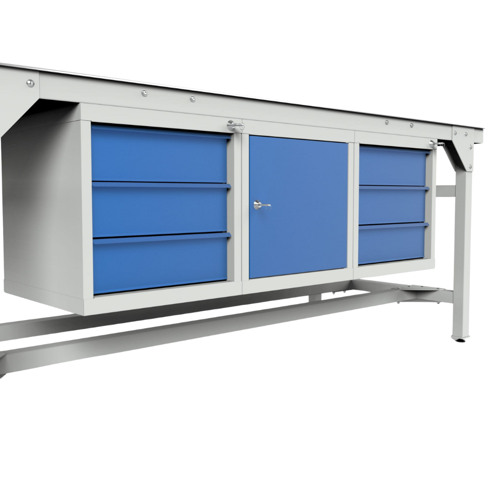 Integrated storage consists of three tool cabinets with central locking, increasing ergonomics and usable storage space for tools, assembly components, and spare parts. The workbench provides a maximum load capacity of 1500 kg, assuming uniform load distribution.