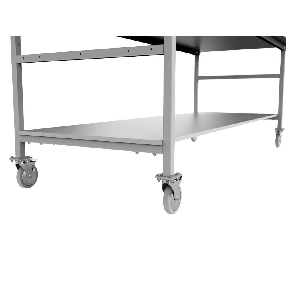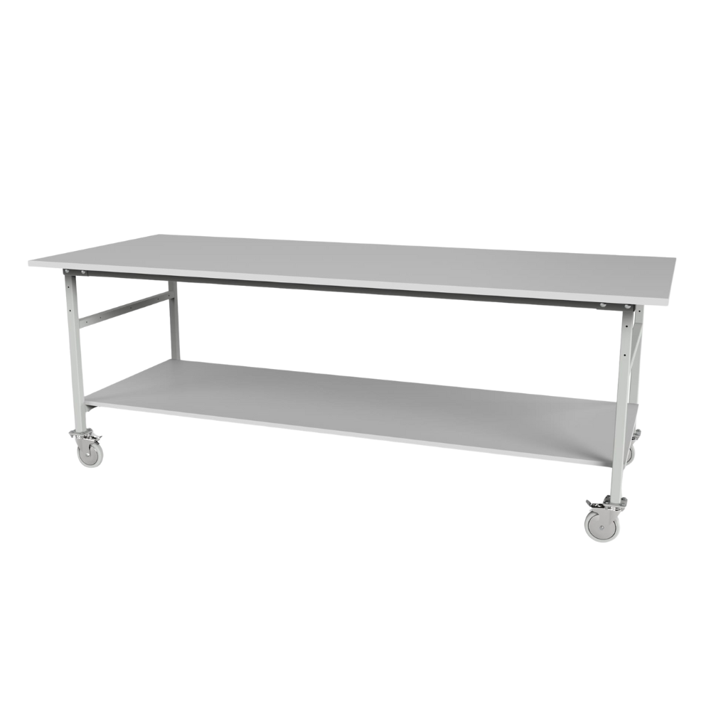 This mobile workbench is a large table designed for assembly and handling tasks requiring an extended working surface. The structure is manufactured from steel profiles and powder-coated in RAL 7035 (light grey). The table is equipped with a lower shelf for additional storage and mounted on wheels for easy relocation within the workspace.