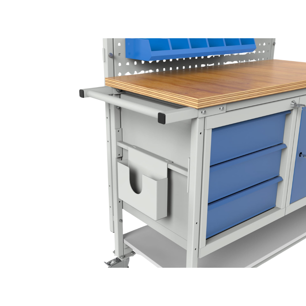 Our workshop trolley is a modular, mobile workstation designed for use in workshops, warehouses, production halls, service areas, and garages. The trolley combines a durable steel structure with a hardwood plywood worktop, integrated storage cabinets, and multiple perforated panels for flexible tool organization. The configuration allows adaptation to specific operational requirements.